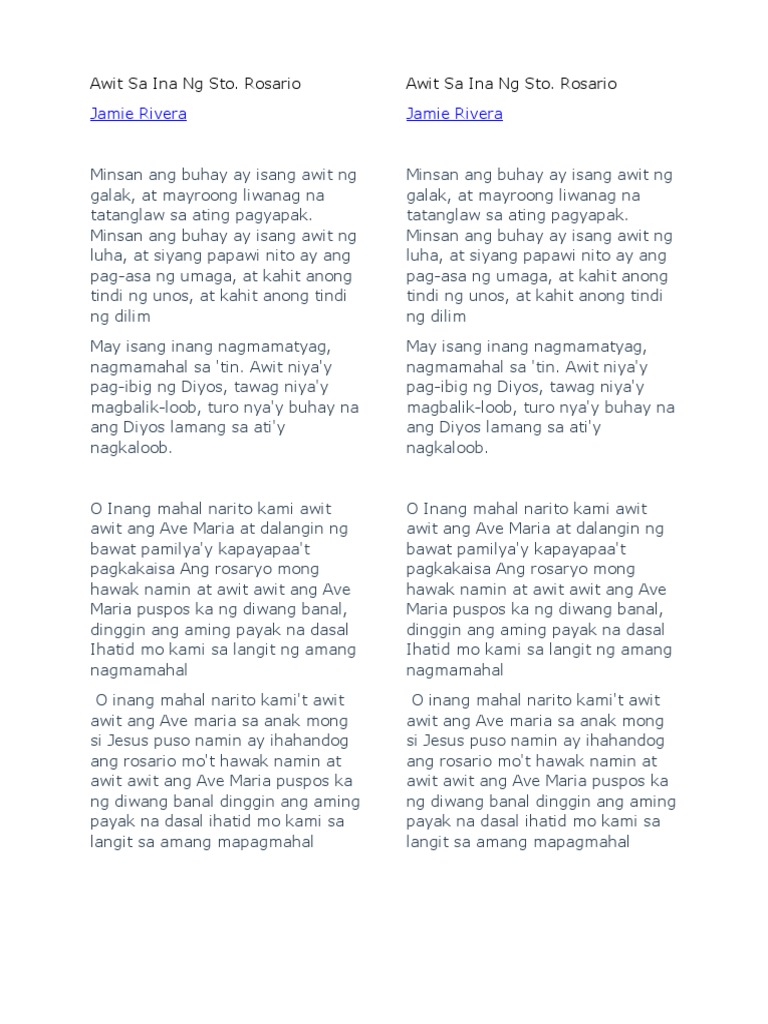 View Awit Sa Ina Ng Santo Rosariodocx from ENGLISH 101 at University of Santo Tomas. Rosario is a gospel song sung by Jamie Rivera. Awit Sa Ina Ng Sto.