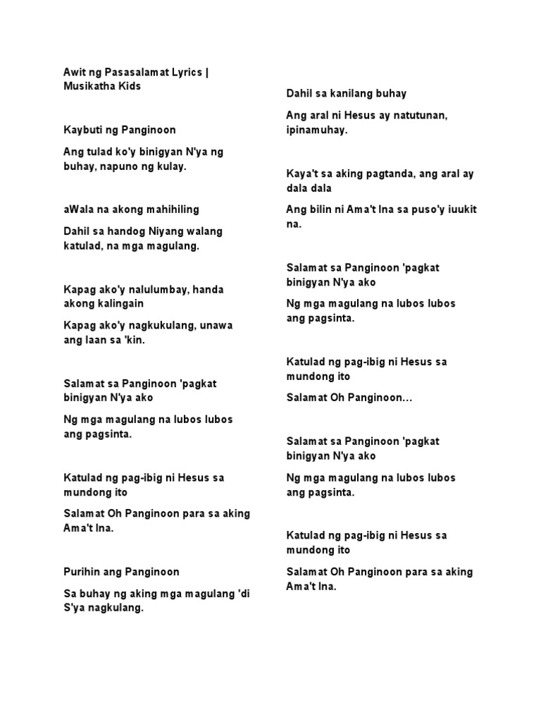 Awit Ng Pasasalamat Lyrics Pdf
